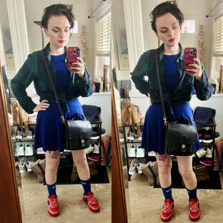 - Blue crushed velvet dress – Forever 21, many years ago; bought to wear to our first collarversary date, if I recall correctly!